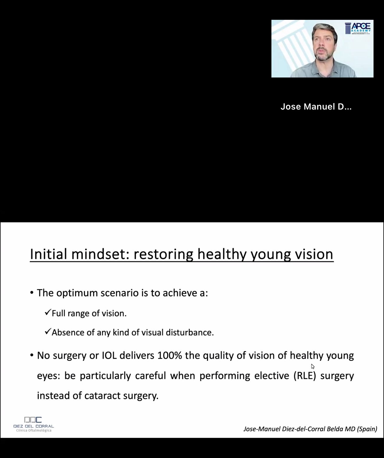 Con una interesantísima exposición a cargo del doctor Jose Manuel Díez Del Corral Belda, compañero de APOE y Medical Advisor de varias empresas del sector, titulada “ Incorporando las lentes correctoras de presbicia a la práctica habitual “, de forma clara y amena ha expuesto todo lo concerniente a la cirugía de presbicia, con interesantes tips a tener en cuenta, no solo para iniciarse en la misma, sino para aquellos que ya tienen experiencia.